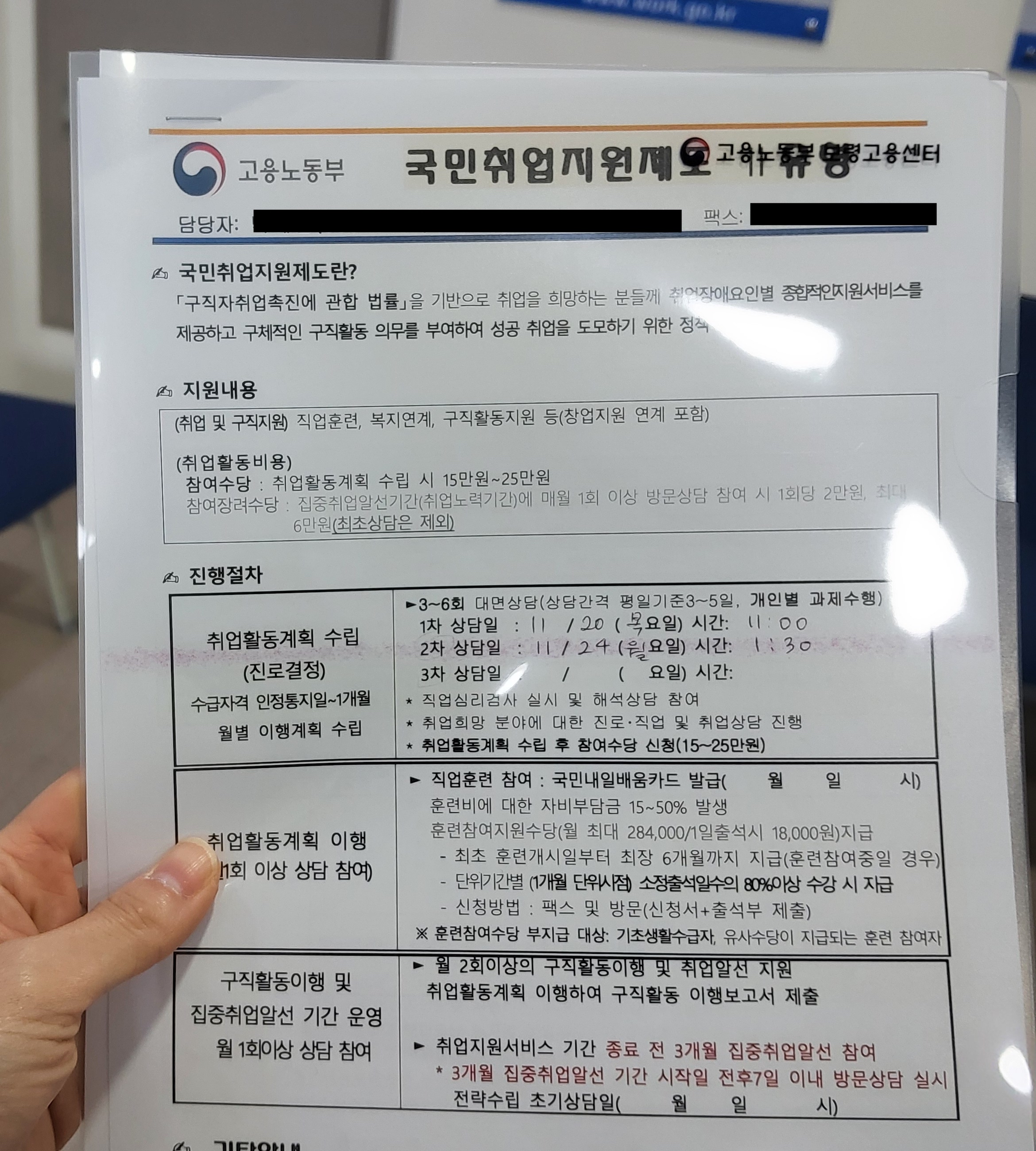 신청한 지 며칠 지나지 않아 고용센터에서 1차 방문 일정 안내를 받았습니다. 지정된 날짜에 고용센터를 방문해 상담을 진행했는데, 처음이라 조금 긴장되었지만 상담사님이 차분히 안내해 주셔서 부담 없이 이야기를 나눌 수 있었습니다.