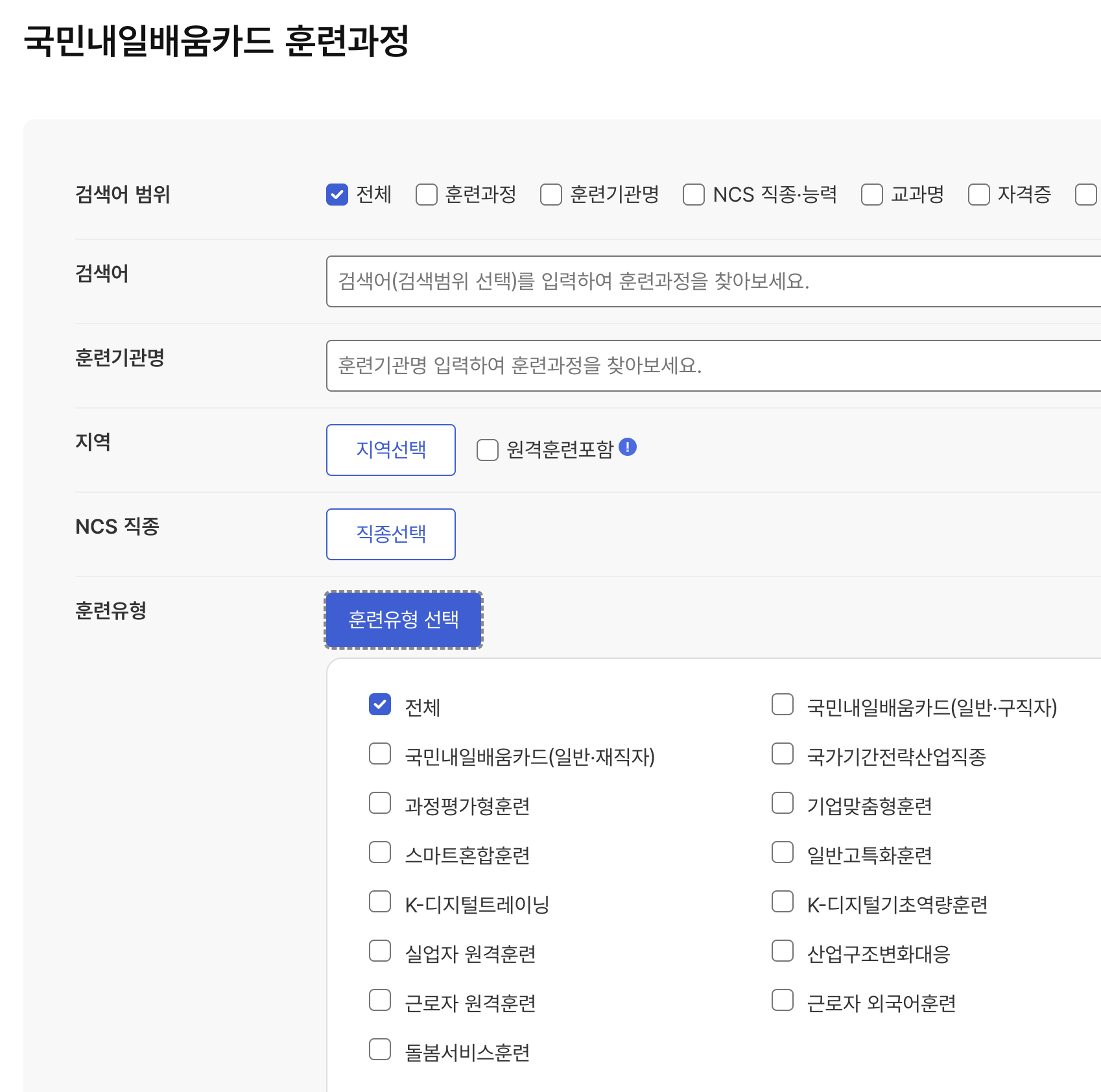 - 훈련유형을 선택하고 검색하면 내 조건에 맞는 훈련 찾기가 편리함